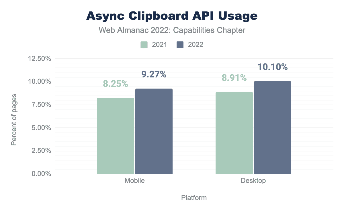 The Async Clipboard API saw growth in usage from 8.91% in 2021 to 10.10% in 2022 on desktop. On mobile, there was also growth from 8.25% in 2021 to 9.27% in 2022. As a result, this year, the Async Clipboard API was the most used API on both desktop and mobile, beating the Web Share API (last year’s most used API).