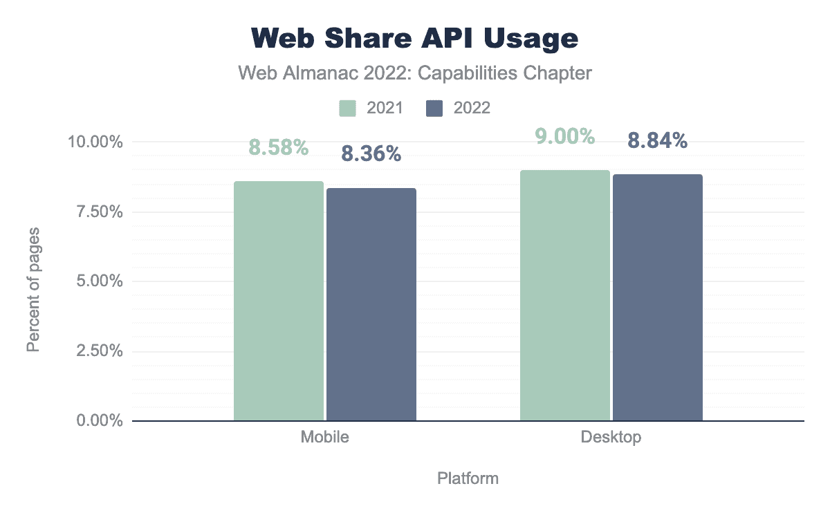 The Web Share API shrunk in usage from 9.00% in 2021 to 8.84% in 2022 on desktop. On mobile, usage shrunk from 8.58% in 2021 to 8.36% in 2022. As a result, this year, the Web Share API was the second most used API on both desktop and mobile, falling behind the Async Clipboard API—last year’s second most used API.